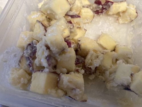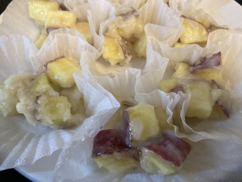 - さつまいもは小さめ角切りで砂糖と塩少々をまぶして10分くらい放置